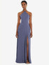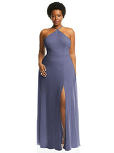 Embrace glamour with the attention-grabbing diamond halter neckline on this lux chiffon gown. A formal design with a natural waist, this maxi dress creates a flowing silhouette with a modified circle skirt with a slit up the thigh and a natural waist that defines your shape perfectly.