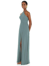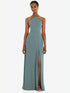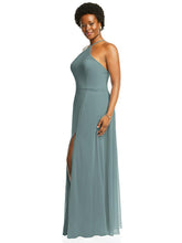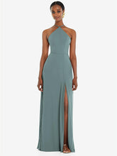 Embrace glamour with the attention-grabbing diamond halter neckline on this lux chiffon gown. A formal design with a natural waist, this maxi dress creates a flowing silhouette with a modified circle skirt with a slit up the thigh and a natural waist that defines your shape perfectly.