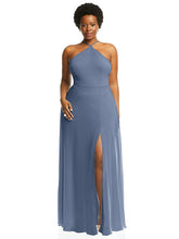 Embrace glamour with the attention-grabbing diamond halter neckline on this lux chiffon gown. A formal design with a natural waist, this maxi dress creates a flowing silhouette with a modified circle skirt with a slit up the thigh and a natural waist that defines your shape perfectly.