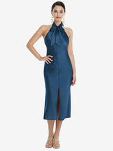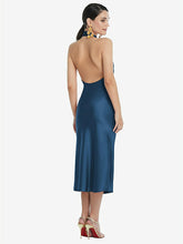 A center slit creates a peek-a-boo effect for this exceptional lux charmeuse bias dress. This midi-length dress is highlighted with a stand collar and scarf tie that adds detail and elegance. Show your sexy side with an open back.