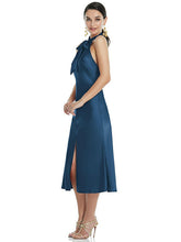 【STYLE: LB038】Scarf Tie Stand Collar Midi Bias Dress with Front Slit【COLOR: Dusk Blue】