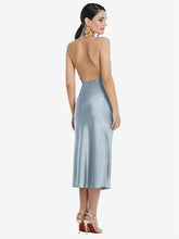 A center slit creates a peek-a-boo effect for this exceptional lux charmeuse bias dress. This midi-length dress is highlighted with a stand collar and scarf tie that adds detail and elegance. Show your sexy side with an open back.