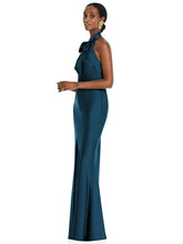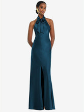 Strut into your next event with confidence in this beautiful lux charmeuse bias gown. Full-length with a center slit and an open back for a touch of sexiness, this dress is defined with its scarf tie detail and stand collar. This gorgeous gown's graceful silhouette is ideal for a formal wedding or soiree.