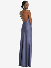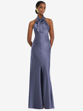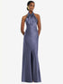Strut into your next event with confidence in this beautiful lux charmeuse bias gown. Full-length with a center slit and an open back for a touch of sexiness, this dress is defined with its scarf tie detail and stand collar. This gorgeous gown's graceful silhouette is ideal for a formal wedding or soiree.