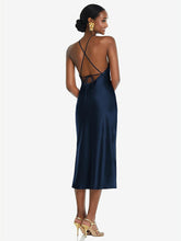 Delicate in every aspect, this lux charmeuse bias dress is defined by its eye-catching diamond halter. Slim, adjustable straps crisscross an open back for a sexy but sophisticated finishing touch to this midi-length slip dress.