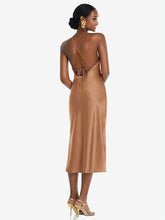 Delicate in every aspect, this lux charmeuse bias dress is defined by its eye-catching diamond halter. Slim, adjustable straps crisscross an open back for a sexy but sophisticated finishing touch to this midi-length slip dress.