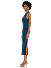 Shirring adds definition and visual interest to the jewel neckline of this beautiful lux charmeuse sleeveless gown. This midi-length dress boasts a bias skirt with a slit that creates plenty of freedom to dance the night away. The back is accentuated with a keyhole detail that adds the perfect touch of sexiness.