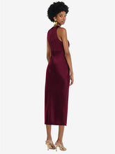 Shirring adds definition and visual interest to the jewel neckline of this beautiful lux charmeuse sleeveless gown. This midi-length dress boasts a bias skirt with a slit that creates plenty of freedom to dance the night away. The back is accentuated with a keyhole detail that adds the perfect touch of sexiness.