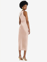 Shirring adds definition and visual interest to the jewel neckline of this beautiful lux charmeuse sleeveless gown. This midi-length dress boasts a bias skirt with a slit that creates plenty of freedom to dance the night away. The back is accentuated with a keyhole detail that adds the perfect touch of sexiness.