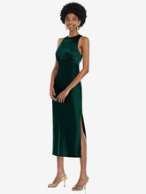 Shirring adds definition and visual interest to the jewel neckline of this beautiful lux charmeuse sleeveless gown. This midi-length dress boasts a bias skirt with a slit that creates plenty of freedom to dance the night away. The back is accentuated with a keyhole detail that adds the perfect touch of sexiness.