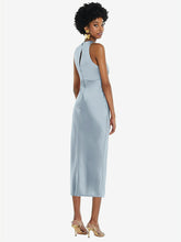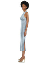 Shirring adds definition and visual interest to the jewel neckline of this beautiful lux charmeuse sleeveless gown. This midi-length dress boasts a bias skirt with a slit that creates plenty of freedom to dance the night away. The back is accentuated with a keyhole detail that adds the perfect touch of sexiness.