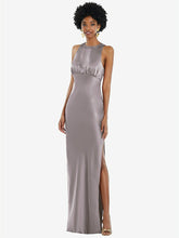 Embrace understated glamour with the sexy silhouette of this lux charmeuse sleeveless gown. This floor-length gown shows off your shoulders with a jewel neckline and shirred bodice that creates chic definition. A bias skirt with a slide slit maintains a sleek look while providing plenty of movement for dancing right up to the last song of the night.