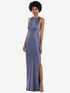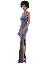 Embrace understated glamour with the sexy silhouette of this lux charmeuse sleeveless gown. This floor-length gown shows off your shoulders with a jewel neckline and shirred bodice that creates chic definition. A bias skirt with a slide slit maintains a sleek look while providing plenty of movement for dancing right up to the last song of the night.