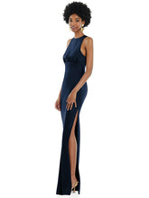 Embrace understated glamour with the sexy silhouette of this lux charmeuse sleeveless gown. This floor-length gown shows off your shoulders with a jewel neckline and shirred bodice that creates chic definition. A bias skirt with a slide slit maintains a sleek look while providing plenty of movement for dancing right up to the last song of the night.