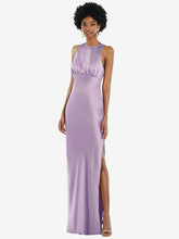 Embrace understated glamour with the sexy silhouette of this lux charmeuse sleeveless gown. This floor-length gown shows off your shoulders with a jewel neckline and shirred bodice that creates chic definition. A bias skirt with a slide slit maintains a sleek look while providing plenty of movement for dancing right up to the last song of the night.