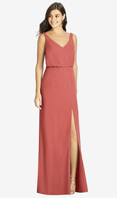 Spotlight your natural curves with a blouson bodice and flattering v-neckline. A side front slit playfully shows off a hint of leg, while lux chiffon fabric lends an air of simple elegance to this full-length soft trumpet dress.