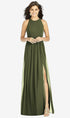 【STYLE: TH008】Shirred Skirt Jewel Neck Halter Dress with Front Slit【COLOR: Olive Green】