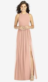 【STYLE: TH008】Shirred Skirt Jewel Neck Halter Dress with Front Slit【COLOR: Pale Peach】