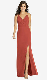 Regal and refined, this full-length lux chiffon dress makes a stunning statement. A draped surplice bodice blends beautifully with a mermaid skirt with a flattering side front slit to gracefully highlight your physique.