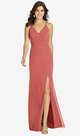 Regal and refined, this full-length lux chiffon dress makes a stunning statement. A draped surplice bodice blends beautifully with a mermaid skirt with a flattering side front slit to gracefully highlight your physique.