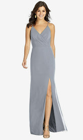 Regal and refined, this full-length lux chiffon dress makes a stunning statement. A draped surplice bodice blends beautifully with a mermaid skirt with a flattering side front slit to gracefully highlight your physique.