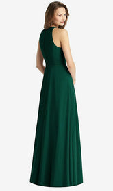 Long sleeveless lux chiffon maxi dress with modified halter neckline and keyhole back. Circle skirt.