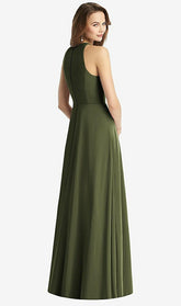 Long sleeveless lux chiffon maxi dress with modified halter neckline and keyhole back. Circle skirt.