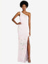 Full length one shoulder lux chiffon dress with a modified trumpet skirt and slit at side front.