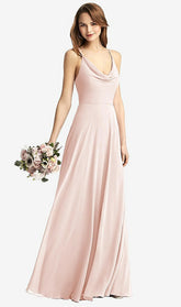 Full length lux chiffon maxi dress with soft cowl neckline and skinny spaghetti straps. Inverted v-back. Circle skirt.
