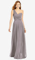 A peek-a-boo sweetheart bodice flirtatiously shows off a one shoulder lux chiffon full-length bridesmaid dress. Wispy and dreamy, the circle skirt floats like a cloud with subtle draping.