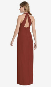 Enjoy a flattering design and luscious fabric that makes this full-length lux chiffon dress a perfect option for formal and semi-formal events. A modified V-neck halter offers just enough coverage, and complements shirred back straps from a triangle cutout. With a modified circle skirt, its overall design delivers comfort and style.