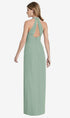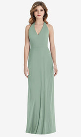 Enjoy a flattering design and luscious fabric that makes this full-length lux chiffon dress a perfect option for formal and semi-formal events. A modified V-neck halter offers just enough coverage, and complements shirred back straps from a triangle cutout. With a modified circle skirt, its overall design delivers comfort and style.