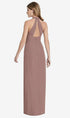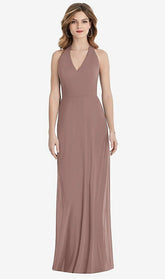 Enjoy a flattering design and luscious fabric that makes this full-length lux chiffon dress a perfect option for formal and semi-formal events. A modified V-neck halter offers just enough coverage, and complements shirred back straps from a triangle cutout. With a modified circle skirt, its overall design delivers comfort and style.