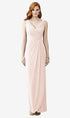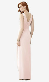 Eye-pleasing asymmetry plays into the romantic silhouette of this full-length sleeveless lux chiffon dress. A draped bodice and skirt shows off the romantic look of a v-neckline and a v-back.