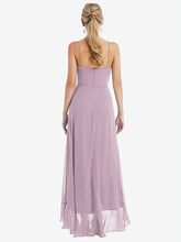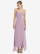 Stylishly simple with an elegant edge, this lux chiffon maxi dress features a soft rounded neckline with slim spaghetti straps that show off just enough skin. A ruffle trim along the high low skirt adds a playful touch to the understated silhouette. Flirty and classy all at once, it's the perfect dress for a black-tie affair or any formal occasion.