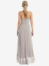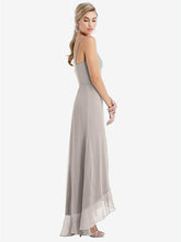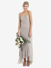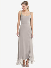 Stylishly simple with an elegant edge, this lux chiffon maxi dress features a soft rounded neckline with slim spaghetti straps that show off just enough skin. A ruffle trim along the high low skirt adds a playful touch to the understated silhouette. Flirty and classy all at once, it's the perfect dress for a black-tie affair or any formal occasion.