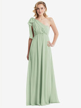 Radiate romance with this elegant, lux chiffon empire waist dress. Featuring three looks in one, this gorgeous gown features sash tie straps that convert it to a bow shoulder, one shoulder, or halter. A flowy shirred skirt completes the dreamlike look of this stunning formal dress.