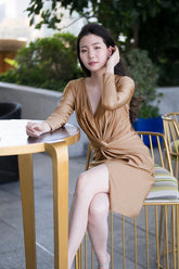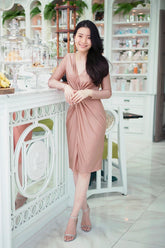 ウエストのドレープがお腹周りをカバーしつつ、特徴的なディテールを生み出しています