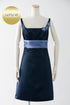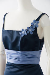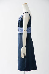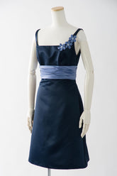サッシュベルトと胸元にワンポイントのコサージュがデザインされたサテン膝丈ドレス