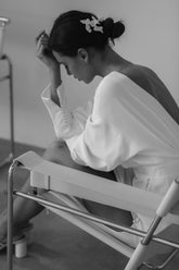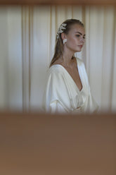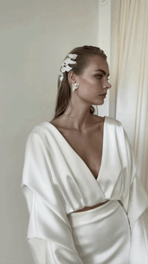 For the abstract + anti-bride mentality. Tufts of chiffon dance along this set to create a fusion of soft texture and structured lines. Raw edges allow for a more organic impression.