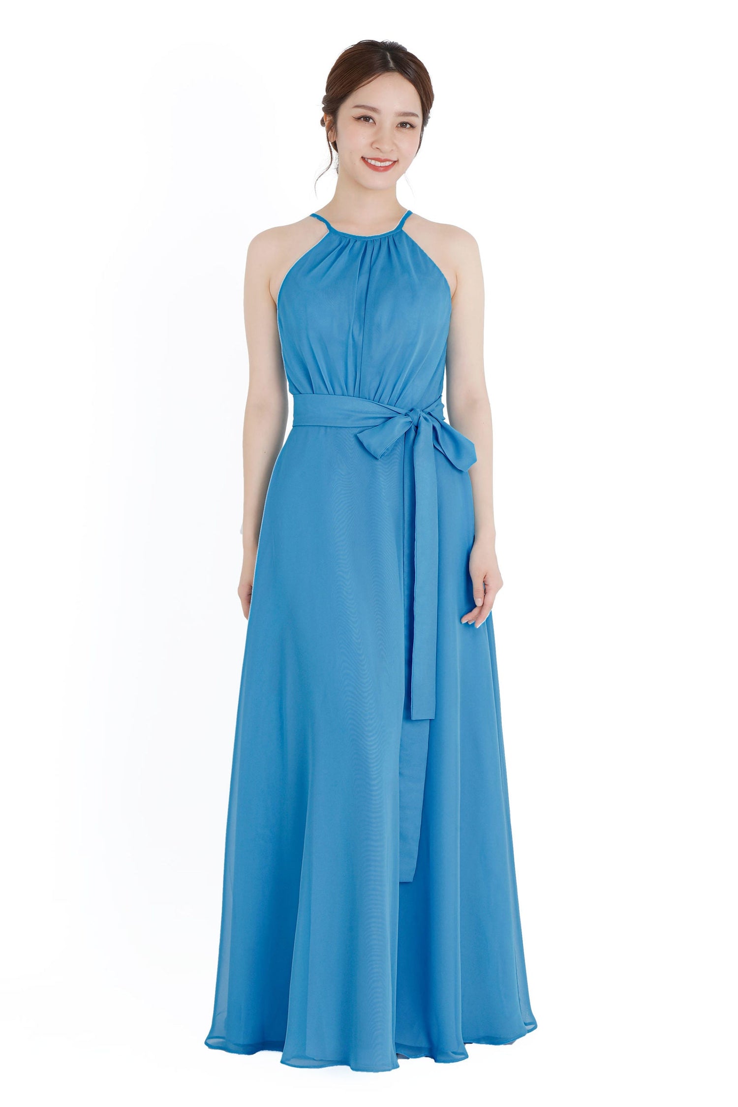 巻き方自在なウエストサッシュが付属した、ホルターネックデザインのロングドレス