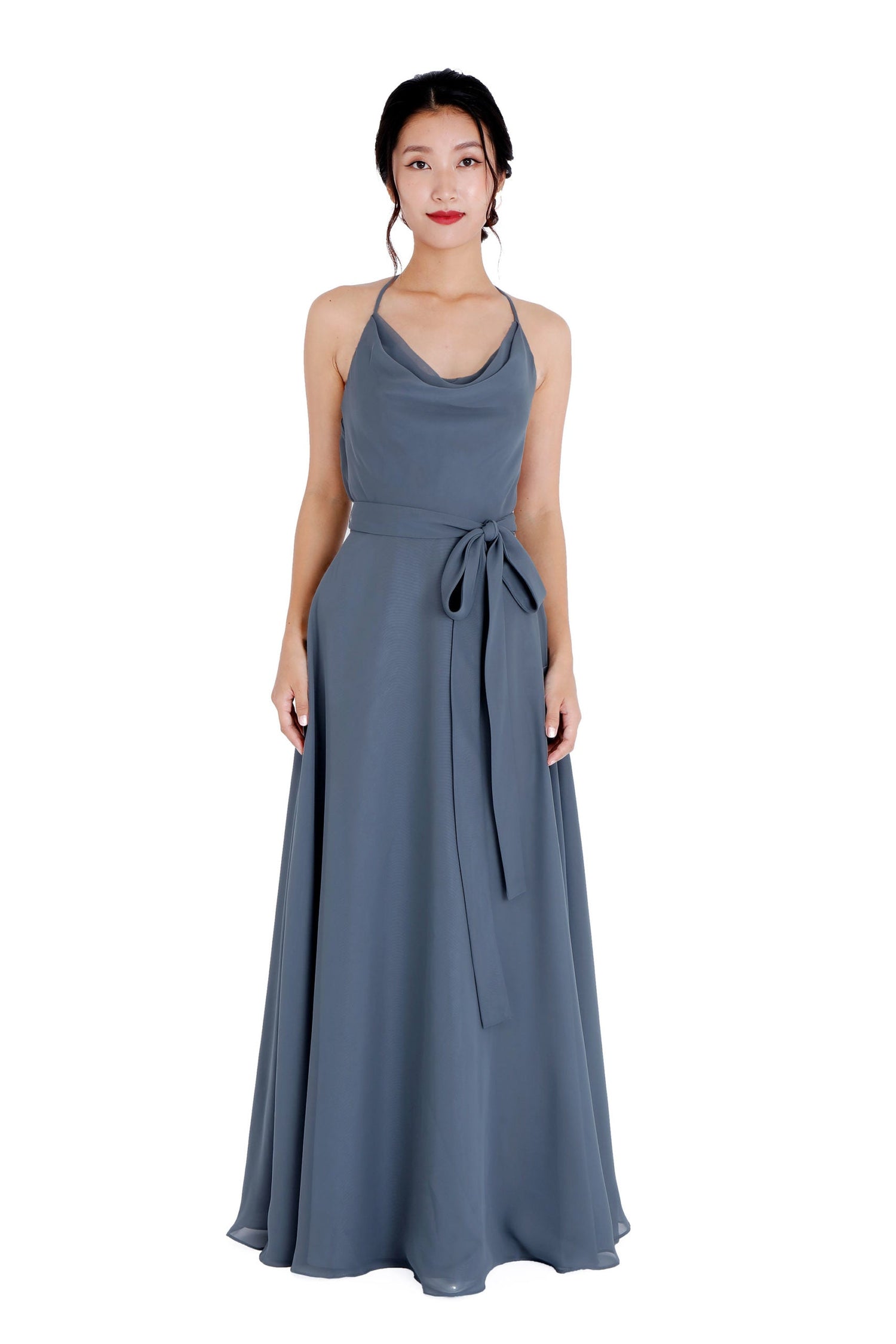 ゆったりとしたカウルネックが特徴ののロングドレス