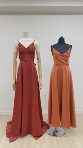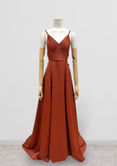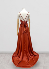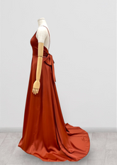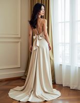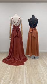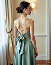 バックスタイルがクロスストラップ、ウエストはリボンで結ぶデザインのサテンロングドレス