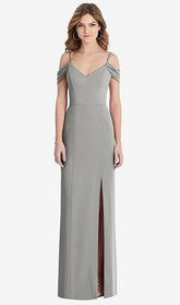【NEW】【STYLE: 1517】オフショルダー シフォン トランペット ガウン 前面 スリット【COLOR: Chelsea Gray】【SIZE: 00-30W】