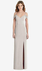 【NEW】【STYLE: 1517】オフショルダー シフォン トランペット ガウン 前面 スリット【COLOR: Oyster】【SIZE: 00-30W】