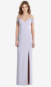 【NEW】【STYLE: 1517】オフショルダー シフォン トランペット ガウン 前面 スリット【COLOR: Silver Dove】【SIZE: 00-30W】
