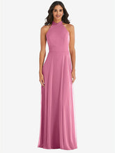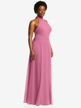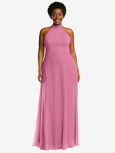 上品でエレガントで真剣にスタイリッシュなこのルックスシフォンホルターマキシドレスは、背中の首にスカーフタイの閉鎖を閉じた低いバルクトの背中と上品なスタンドカラーを特徴としています。修正されたサークルスカートは、古典的な魅力を醸し出す時代を超越したシルエットで外観を完成させます。