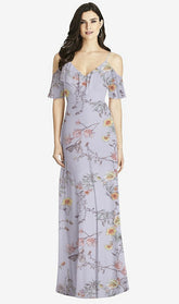 【NEW】【STYLE: 3020】フリル コールドショルダー シフォン マキシ ドレス【COLOR: Butterfly Botanica Silver Dove】【SIZE: 00-30W】
