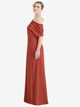 マキシの長さの柔らかいAラインスカートと肩から外れたブルーソンボディスを特徴とする、この柔らかく絹のようなlux charmeuseカクテルドレスを着てください。結婚式に完全に適したこのエレガントなドレスは、花嫁介添人のために素敵な外観になります。