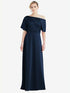 マキシの長さの柔らかいAラインスカートと肩から外れたブルーソンボディスを特徴とする、この柔らかく絹のようなlux charmeuseカクテルドレスを着てください。結婚式に完全に適したこのエレガントなドレスは、花嫁介添人のために素敵な外観になります。